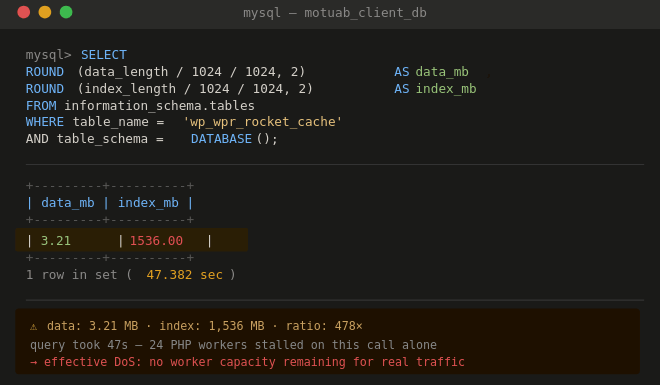 wp_wpr_rocket_cache) - On large WooCommerce sites, this table’s index can grow to 500× the size of the actual data – in our case 3 MB data, 1.5 GB index